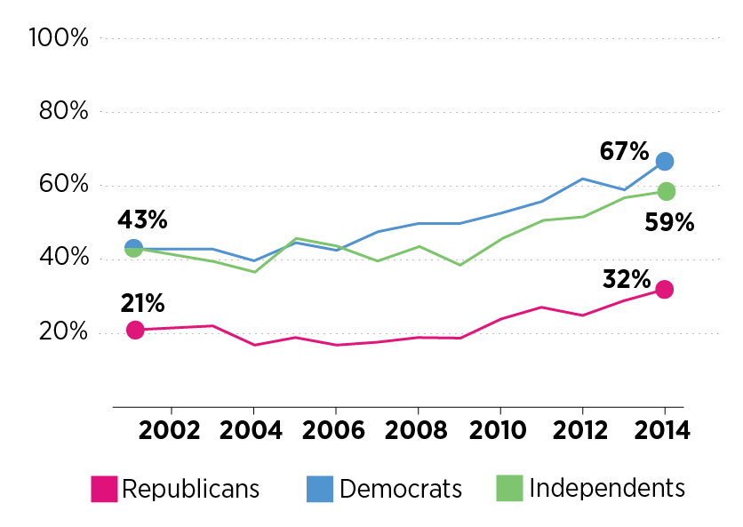 One of the powerful things that's happened as polarization has increased politically is it's begun structuring people's other identities. The one I'm particularly interested in here is race. If you look back at polling around the OJ Simpson verdict or the Bernhard Goetz shooting in New York, Republicans and Democrats — you basically couldn't tell them apart. Now you look at the Zimmerman verdict or you look at what's going on in Ferguson, and opinion on racial issues is very sharply split by party. 14 Do you worry about the merging of racial and partisan identity?